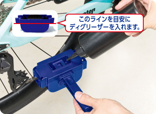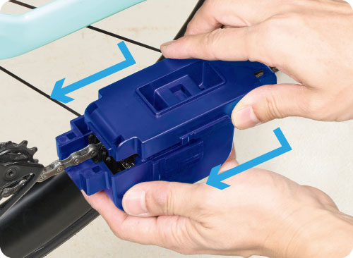 自転車チェーンに簡単にセットするだけ、手軽にスピーディーな洗浄が可能!