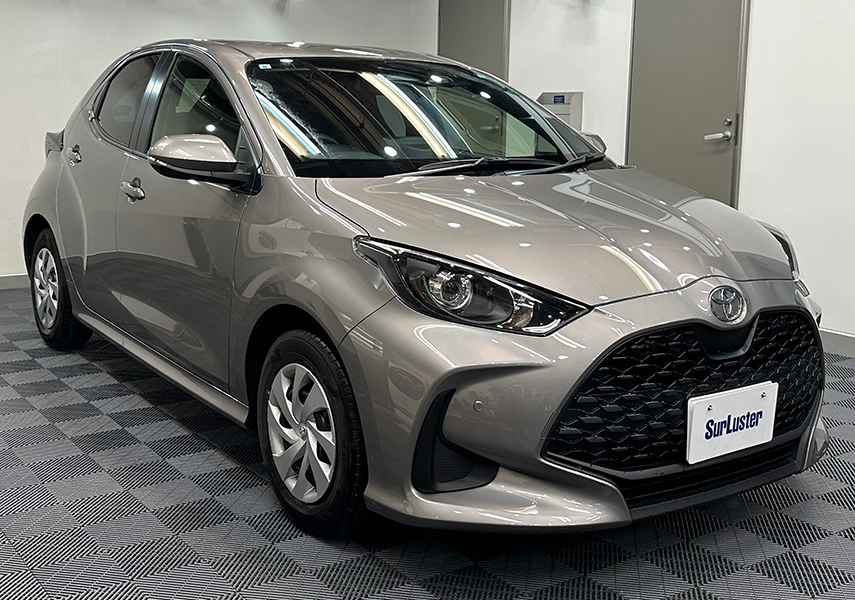レジンコーティングを塗布することで未塗装樹脂パーツの多いヤリスの車全体が引き締まって見えますよ。