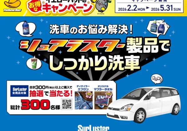 キャンペーン イエローハット×シュアラスターのお得なキャンペーン キャンペーン概要 期間中、イエローハットでシュアラスター商品を300円(税込)以上購入すると、抽選で300名様にシュアラスターオ... 2026.02.02